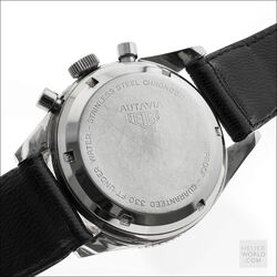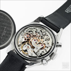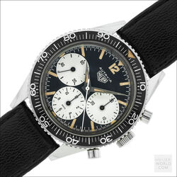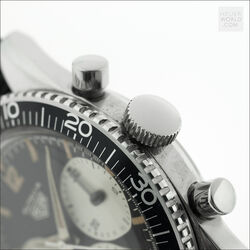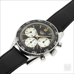 The first of a long line of Autavia named wristwatches was launched in 1962. The dial features large sub registers and applied lume hour markers and is housed in a 37mm diameter screw back case. The earliest examples feature full lume sword hour and minute hands which later changed to steel dauphine style hands with lume insert. The movement is a Valjoux 72 with Ed Heuer signed bridge and case back. Early examples have a movement serial number as well as a case serial number.