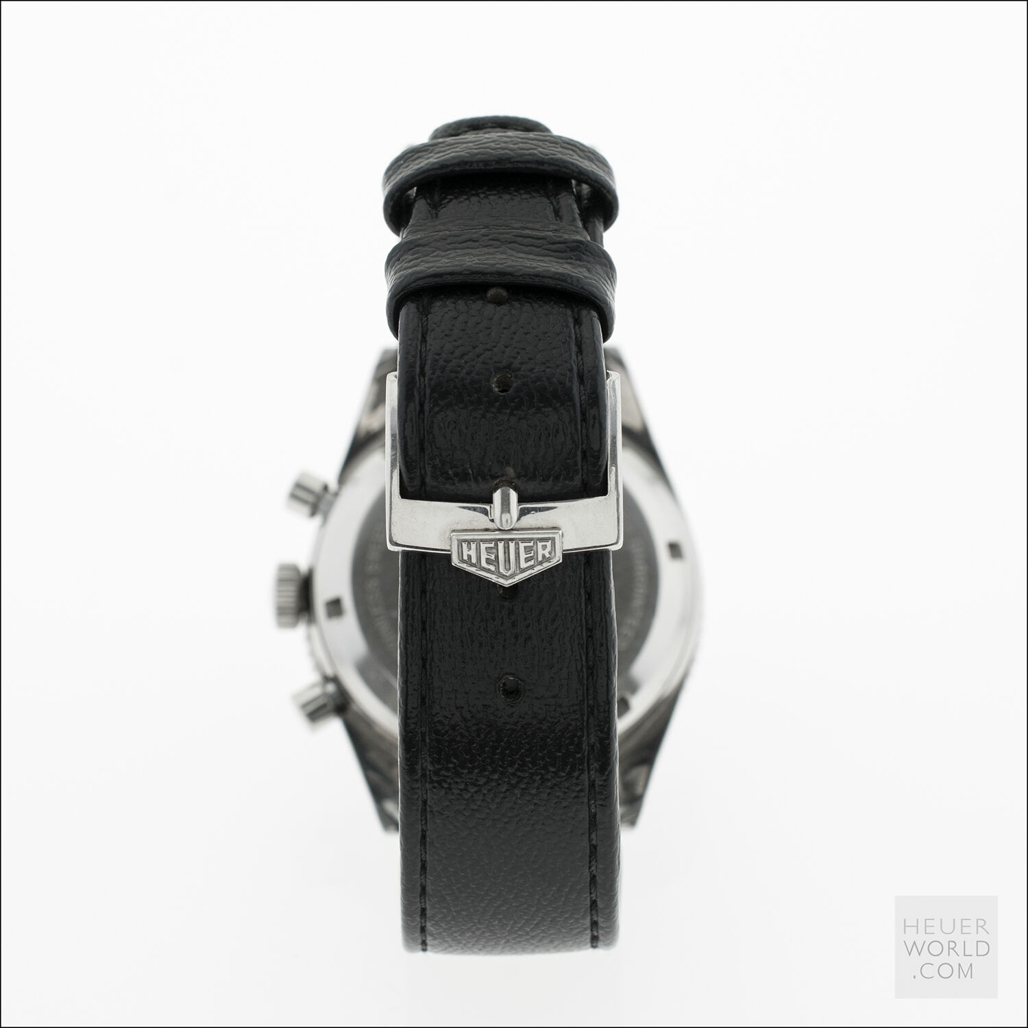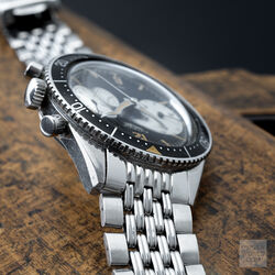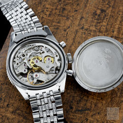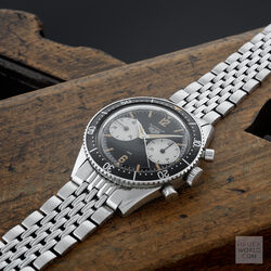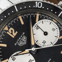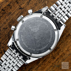 Launched in 1962 in conjunction with the 2446, the first 3646 has the two distinctive large sub registers and applied radium lume hour markers made even more special with the applied numerals at 6 and 12. The 37mm diameter case with wide hour, minute or decimal bezel with lume triangle at 12 houses a Valjoux 92 movement signed Ed Heuer. Caseback is signed Ed Heuer.