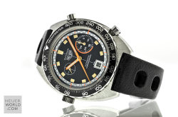 Heuer brought out the Calibre 15 movement in 1972 as a cheaper alternative to the Calibre 12. The Autavia 1563 case is the same as the 1163 and the simplified dial featured a running second hand at "10" and a 30 minute counter at "3". Only three dial combinations were produced including black/black, silver/black and the extremely rare Exotic dial. Cases are stamped 1563 however most know examples of the Exotic Autavia have 1163v cases.
