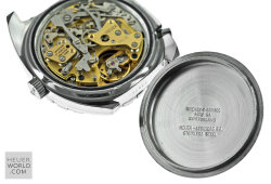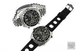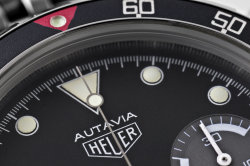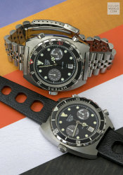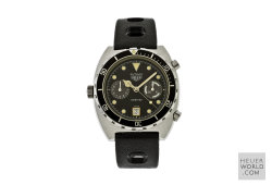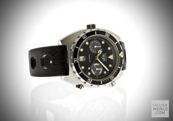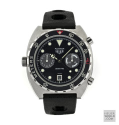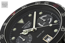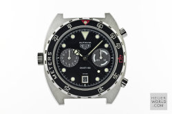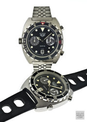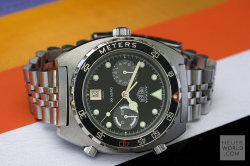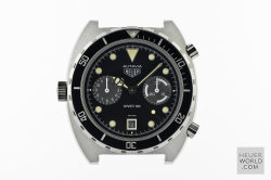 Having seen and felt the full effect of the quartz invasion Heuer still managed to launched its final Autavia, the 11063 in the early 1980's. Various dial, hand and bezel combinations were offered including the new Autavia 11063P Diver 100, a divers chronograph with Mercedes hands and the so called Rolex style uni-direction bezel. There is some conjecture about the alternative decompression bezel but it is genuine and will only fit this case. The case is larger and deeper than its predecessor with 21mm lug width. All cases are marked 11063V.