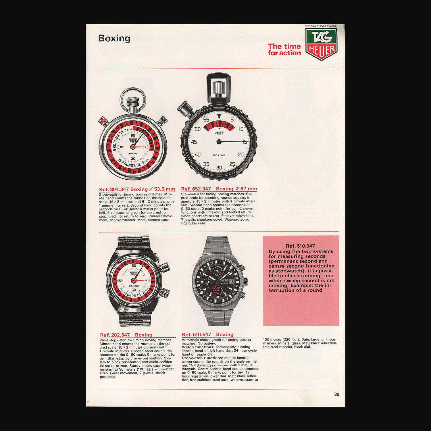 The Heuer Camaro had a relatively short life compared to its 60's counterparts, the Autavia and Carrera. There were however a number of different chronograph models with either two registers, three registers & two registers with date as well as case finishes including stainless steel, gold plated and 18 karat gold. A number of movements were also used all Valjoux and all manual wind. The case shape remained the same with 19mm wide lugs and domed crystal.