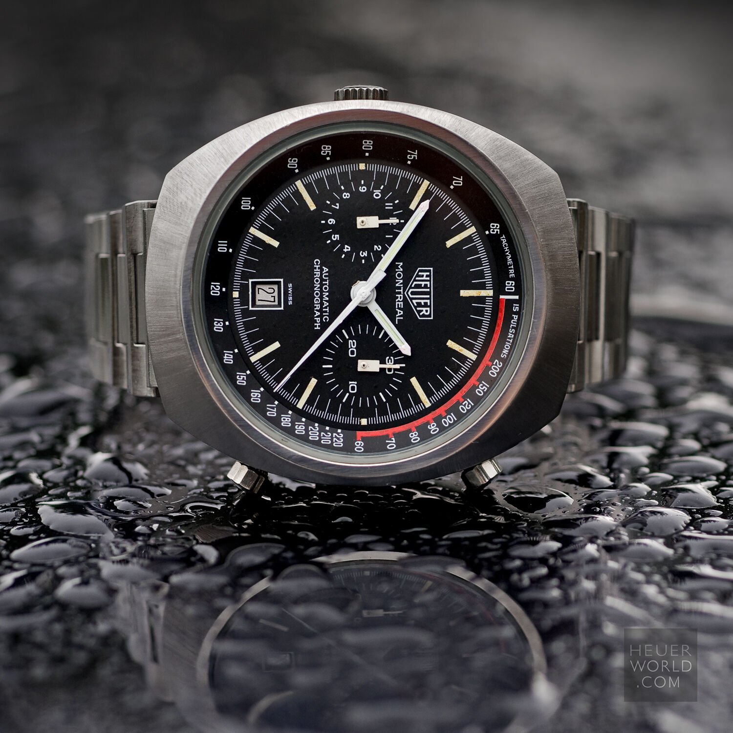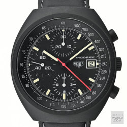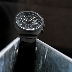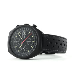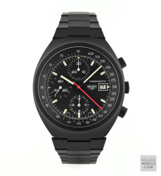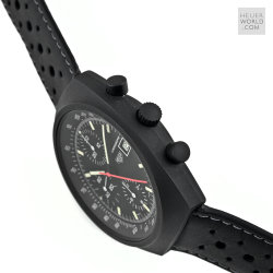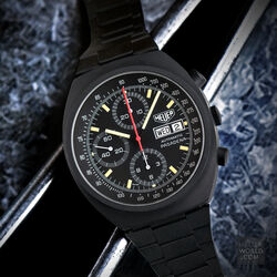 The Pasadena 750.501 was another late example of a mechanical chronograph from Heuer at the time (early 1980’s) when quartz was becoming the dominant force in the wrist watch world. An automatic Valjoux 7750 movement with day & date feature, running second hand and 12 hour chronograph recorder was house in a sleek black PVD coated case with mineral crystal and optional unsigned PVD bracelet. Over time the PVD proved unsuccessful and most examples show more than their fair share of wear on the case and especially the bracelet. The so called "no name" Pasadena refers to the same reference with the same case and movement but with slight dial differences and the no model name.