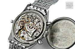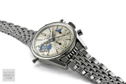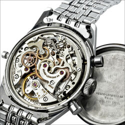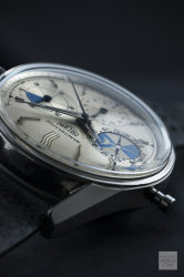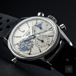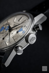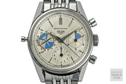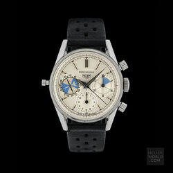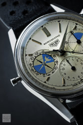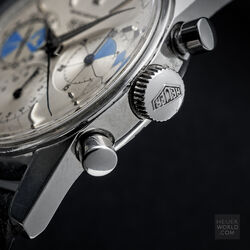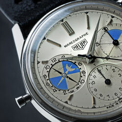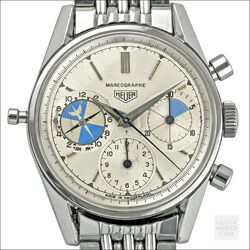 Heuer introduced its line of "tide indication" chronographs in the early 1950's and continued production into the early 1970’s. The majority of these watches were sold under the Abercrombie & Fitch “Seafarer” name however Heuer retained and sold the same watch using the model name “Mareographe”. These watches were aimed at the water sportsman and included a unique tide indication (dial at the 9 o’clock position) as well as a 12 hour chronograph and a 15 minute yachting countdown indication in the minute register at the 3 o’clock position. Heuer modified existing cases used for other models such as the Carrera 2447 and Autavia 2446c to incorporate the additional pusher at “9” to set the tide indicator (see Abercrombie & Fitch section for examples of the Seafarer.)