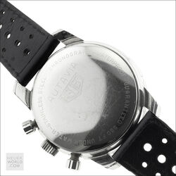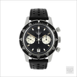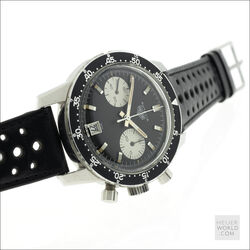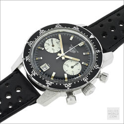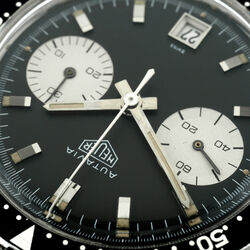 Heuer extended the Autavia range in 1968 to include an example with a date feature coinciding with the launch of the new 40mm compression case. The Autavia 7863c Dato is a manual wind two register chronograph with date powered by a Valjoux 7732 movement. Examples can be found with plain pushers (early) and fluted pushers (later) as well as one of the three bezel options namely H (hour), MH (minute/hour) or T (tachymeter).