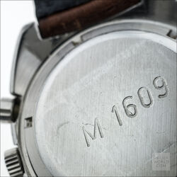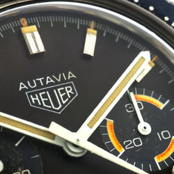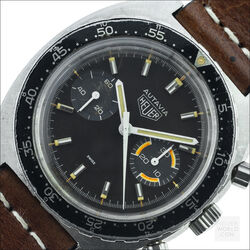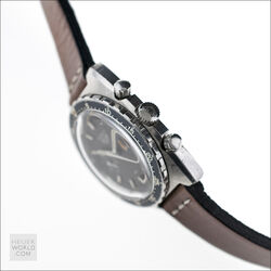 The Autavia 73363 is a simple two register chronograph housed in the classic 1970's Autavia case with the maual wind Valjoux 7733 movement. Dial variants include the black/white, white/black and black/black, the latter know to have been issued by the IDF (Israeli Defence Force). The bi directional bezel could be MH or Tachymeter and features a lume dot in the triagle at the 12 hour position. Pushers are fluted and the crown is signed.