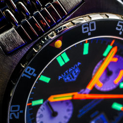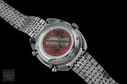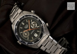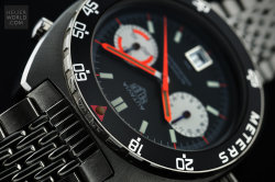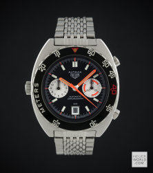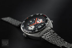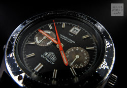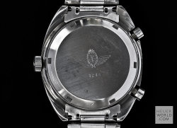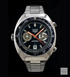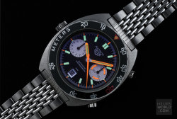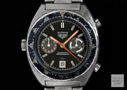 The Autavia 11630 case replaced the 1163 around 1972/1973. The new case was thicker with a flat mineral crystal replacing the domed plexi. The distinguishing feature is the closed pushers as viewed from the top allowing for the uninterrupted bevelled edge and brushed top surface of the case. Various bezel, dial and hand combinations were used in conjunction with the Calibre 12 movement for chronographs and Calibre 14 for the GMT.