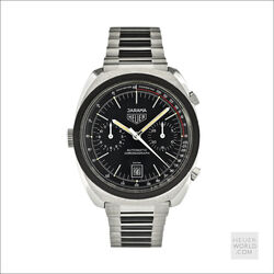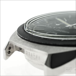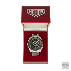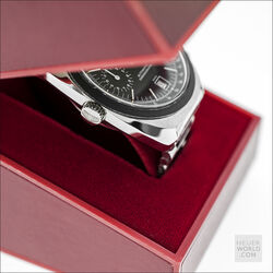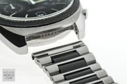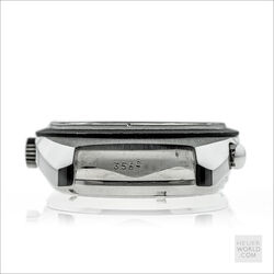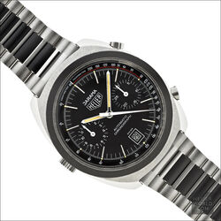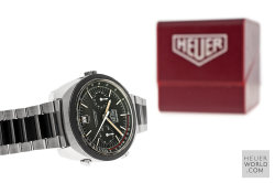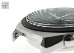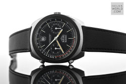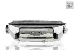 The Heuer Jarama is a blend of elements of other models that came before it but has a unique case that is representative of the era in which it was born. It was launched in 1977 and three references were produced all in the same case. The black dial came with either a flat mat black or machine turned gold bezel. The third example has the gold bezel and a champagne dial. All three have the same style hands and are powered by the automatic Calibre 12 movement. Matching steel and coated bracelets were optional and these were made by NSA with Heuer engraved on the clasp.