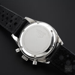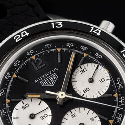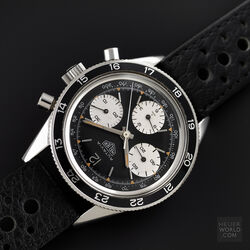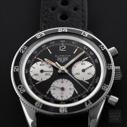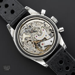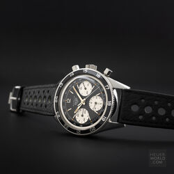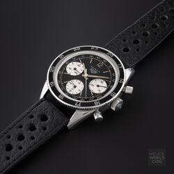 The 3rd execution tachymeter dial is a rare and unusual variant seldom seen in the wild. The inclusion of the tachymeter scale on the dial of a watch with a rotating bezel was a first for Heuer and it was never featured in any of the sales catalogues from the period. This example also features an unusual 13 to 24 hour bezel. The hands are shorter than the standard 3rd execution to compensate for the hour markers being closer to the centre point to accomodate the outer scale. Apart from the dial and hands this is a standard 3rd execution case with Valjoux 72 movement signed Heuer Leonidas.