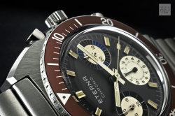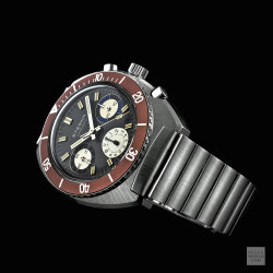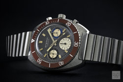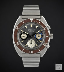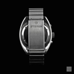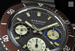 The Eterna Chrono 154 FTP is powered by a manual wind Eterna signed Valjoux 726 movement housed in a 40mm wide case with rotating bezel and serial number (5538829) clearly visible on the backcase. It is fitted with a unique Eterna signed steel bracelet reminiscent of the late 1960’s.