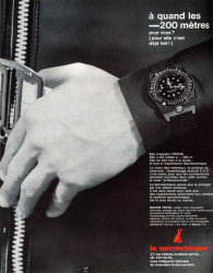 La Spirotechnique is a large and well-known French firm which makes scuba gear, scuba sets and other breathing apparati. Over the years they have commissioned a number of watch manufacturers to produce branded and co-branded dive watches to be sold alongside their scuba gear. The Trition Spirotechnique was designed by J.Parmentier and produced by Dodane in the early 1960’s. The first reference was 143.100 with three lines of script above the “6” marker and was followed by this example, the reference 155.100 with two lines above the “6”. It has a 37mm diameter case with the crown at the “12” position and the hinged crown protection forming part of the overall case design. This example houses an ETA Calibre 2782 automatic movement which is unsigned.