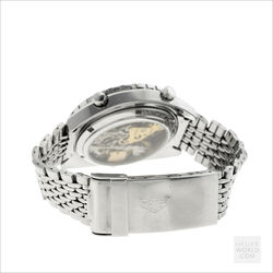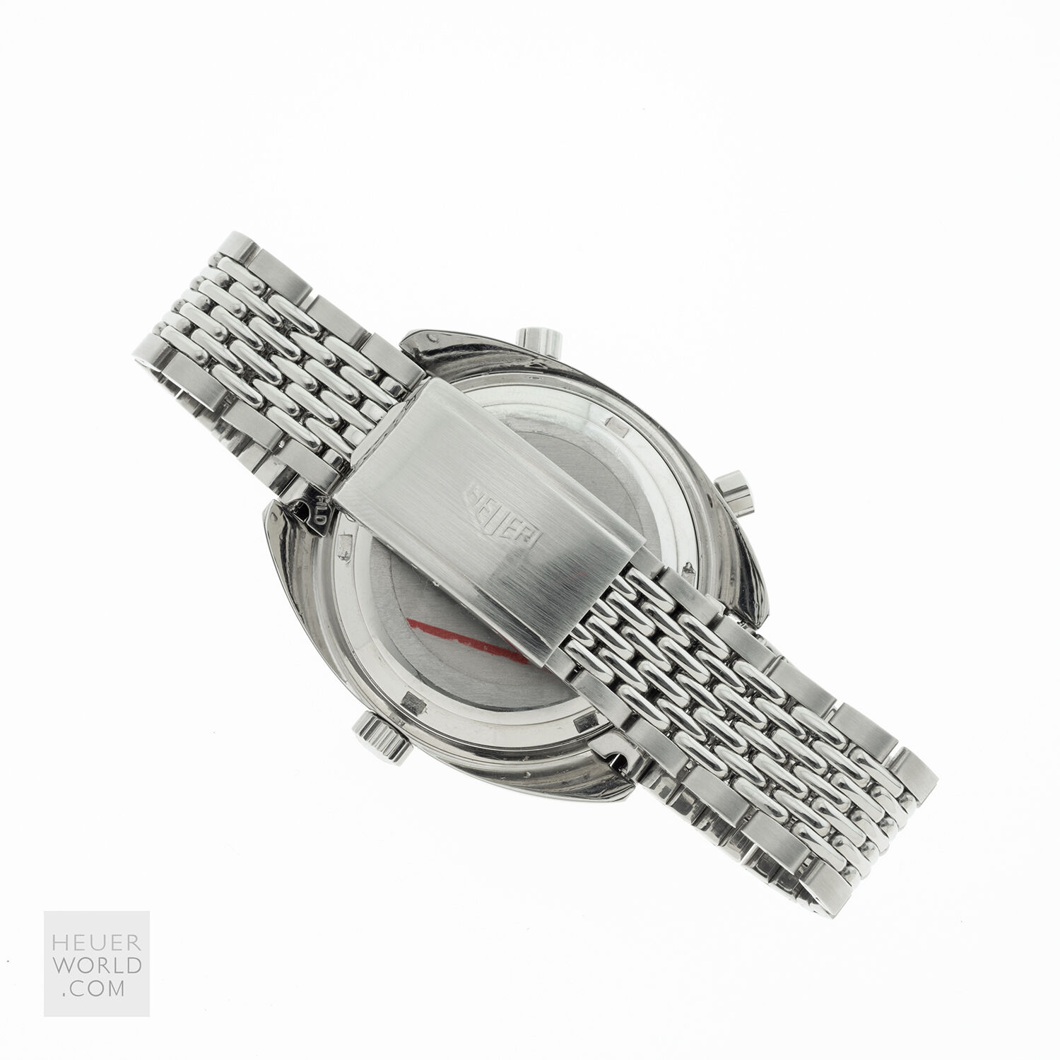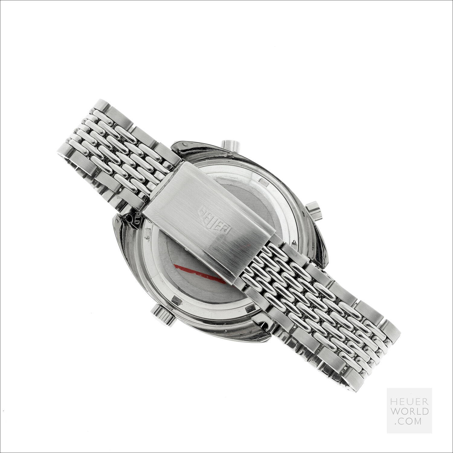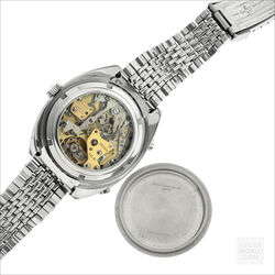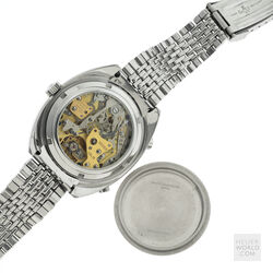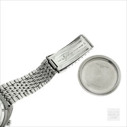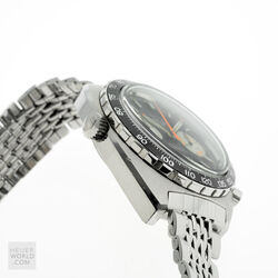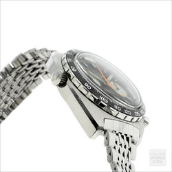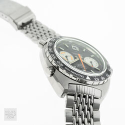 The Autavia 1163 with black dial, white registers and orange accents is the original “Orange Boy” circa 1971. The 40mm diameter case is unpolished with bi-directional Tachymeter bezel and a 242839 serial number. The watch is powered by the Heuer signed Calibre 12 automatic movement. It was serviced in 2020 and has little use since then. The dial and hands have matching original lume and the crystal is a new replacement. The watches comes with both the original and a new display backcase and is fitted with a mark 2 Gay Freres bracelet with flip lock clasp stamped 4/71.