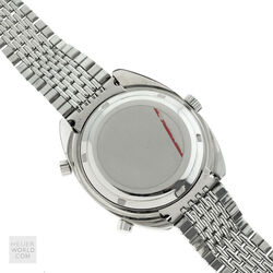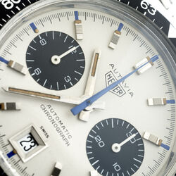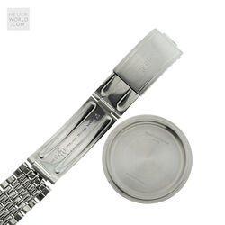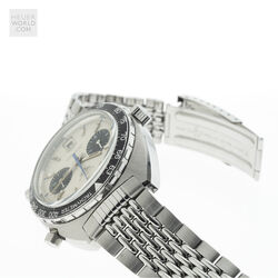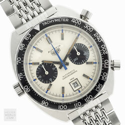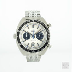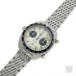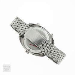 This is a Mark 2 reference 1163 T so called “Siffert” Autavia circa 1969. It was the first of the white dial 1163’s without the Chronomatic name printed on the dial. It is distinguished by the small Heuer logo and preceded the Flat V version. Other early features include the ridged hour markers, plain steel hour and minute hands, protruding pushers and a Calibre 11 movement. The serial number is 141769. The overall condition is excellent and to top it off the watch comes on the very early and extremely rare small clasp 4 row Gay Freres bracelet with HLD end pieces. This must be one of the best Sifferts for sale anywhere in the world right now.