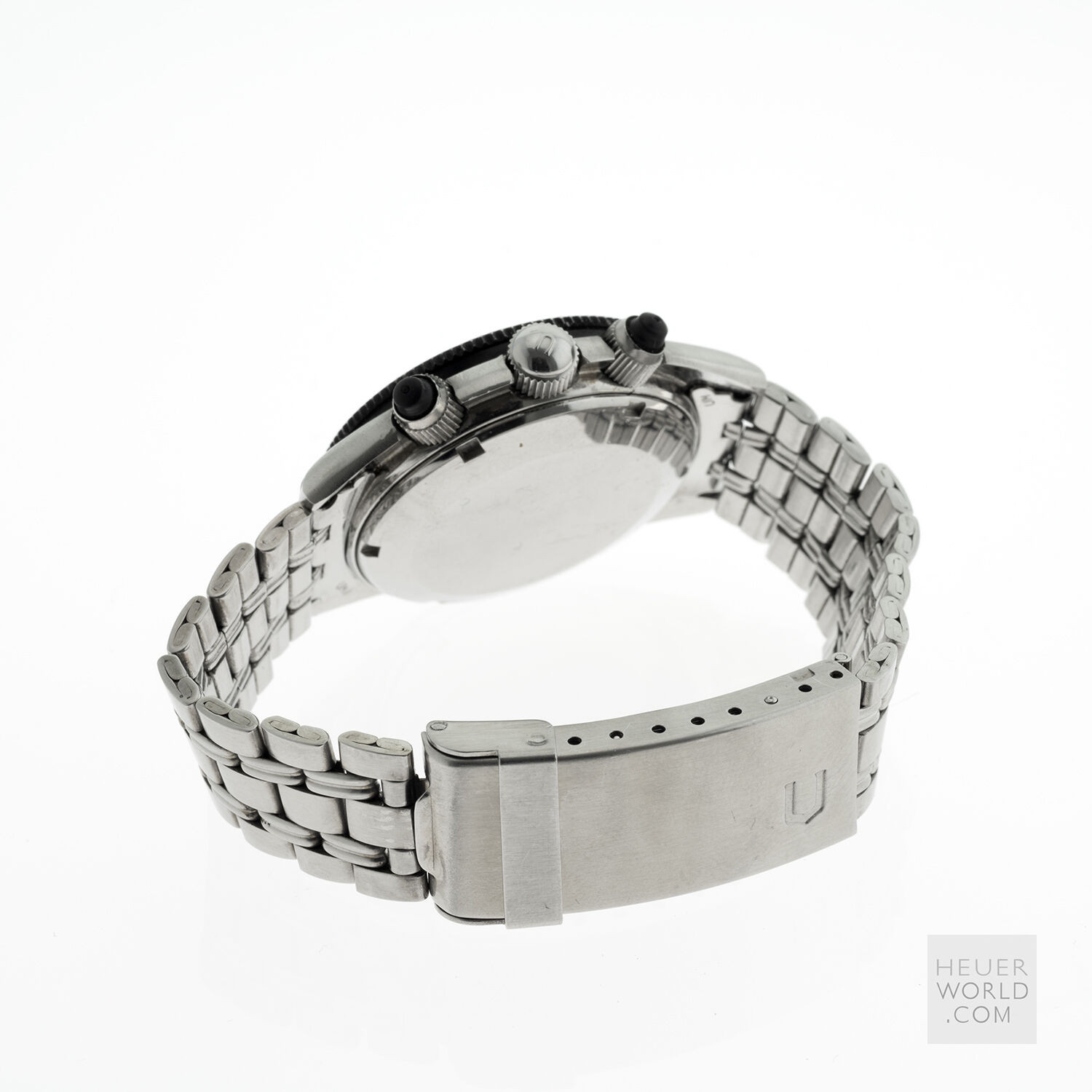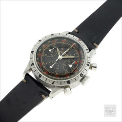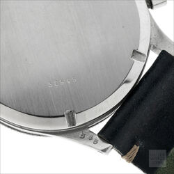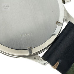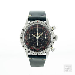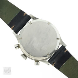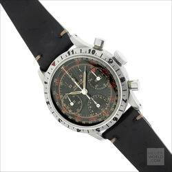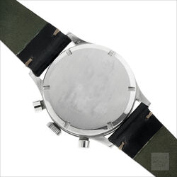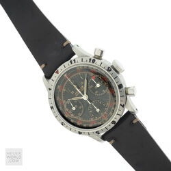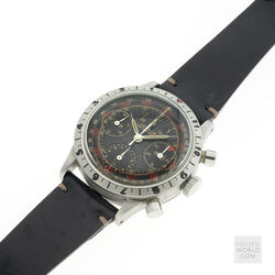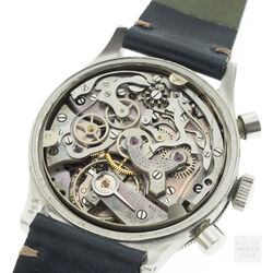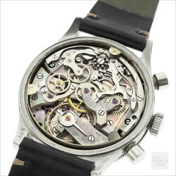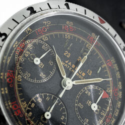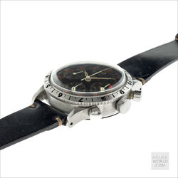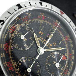 The Jardue Bezelmeter is a pilots watch from the 1940’s with a unique red degreemeter scale on the dial represented by the spiral division marked in degrees for timing aviation turns. It’s a real toolwatch used mainly by American pilots in World War 2. It is one of those obscure brands that has fascinated me for some time. More information can be found at jardur.com. The reference 960 has a steel 38mm diameter waterproof case with pump pushers, unsigned crown and bi-directional countdown bezel with red triangle at 12. It has a manual wind Valjoux 71 movement correctly signed Pilgrim Electric Corp. The caseback has the same signature and has a serial number 32545 on the outside. The case is stamped 545 on the back of one of the lugs. The case retains its original brushed finish and is in remarkable condition considering its age. The print on the dial is bright and crisp and gloss black base has an even aged finish. The original lume is still present on the numerals and visible under UV light. The 6 hands are all original and have been carefully restored to match the age of the watch. It comes on a leather strap.